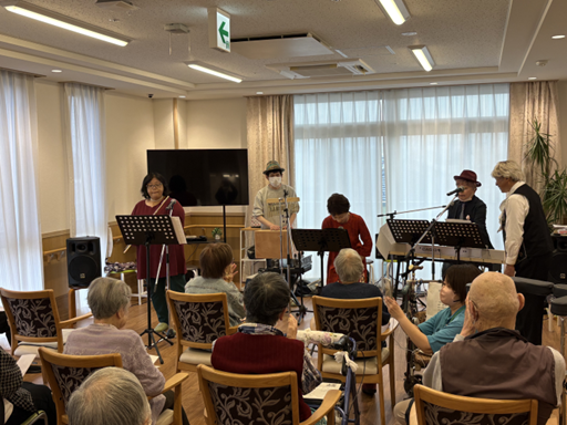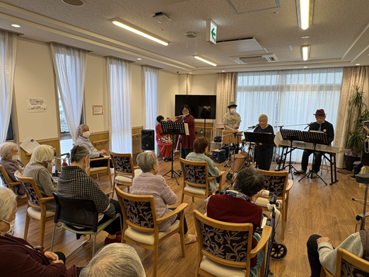 “fly me to the moon””テネシーワルツ”などの海外の名曲から“与作”“瀬戸の花嫁”など、皆様で合唱しやすい懐かしの名曲を演奏していただきました。演奏される曲を聴いて昔を思い出され、涙された方もおられ・・音楽の力はすごいなぁと改めて感じました。