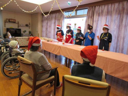 クリスマス会を行いました。職員によるハンドベル演奏では、利用者さまから温かい拍手をいただきました。