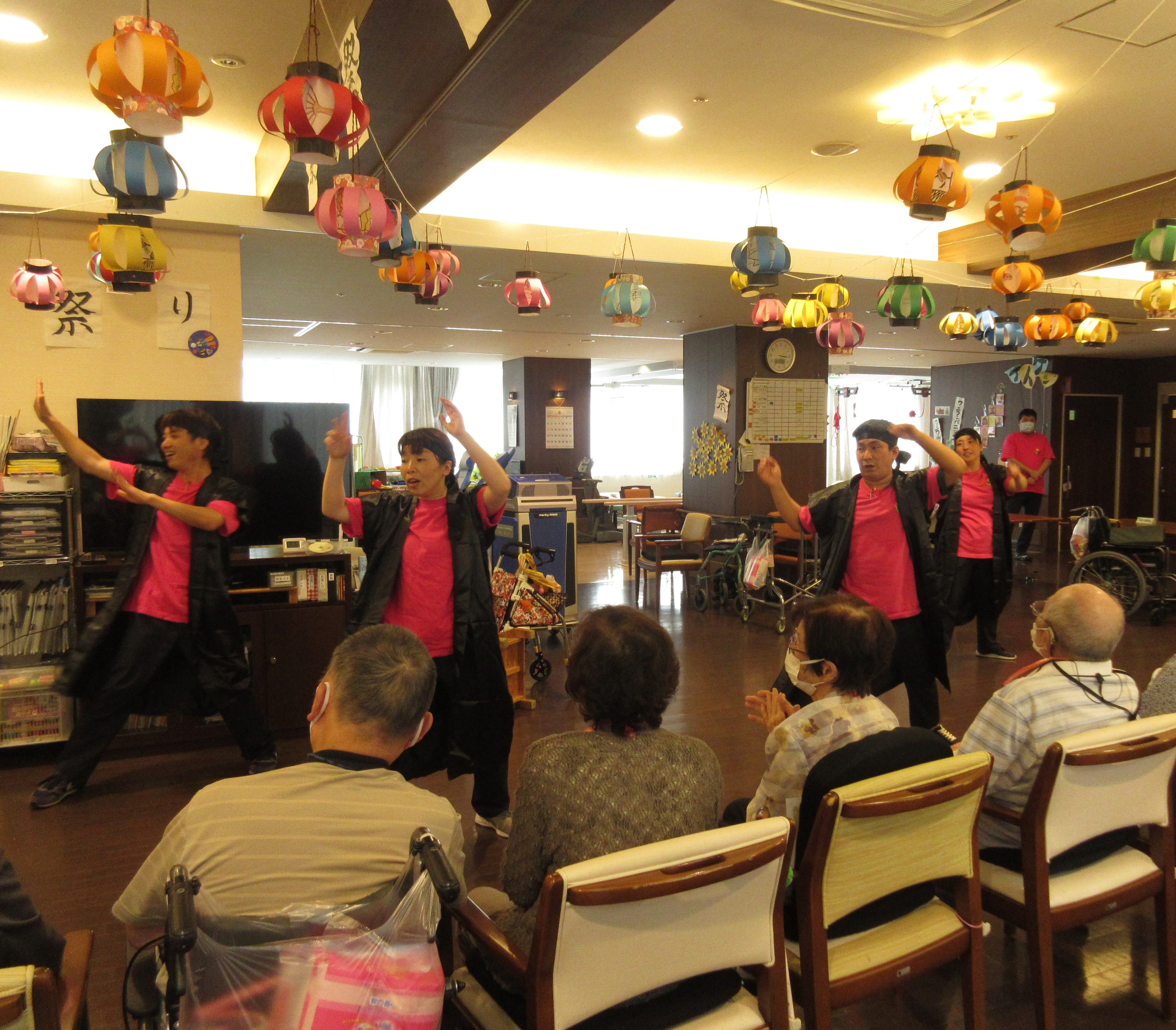 夏祭りの職員による催し物は「よさこいソーラン節」です。皆さまの大きなかけ声に合わせて元気いっぱい踊りました。