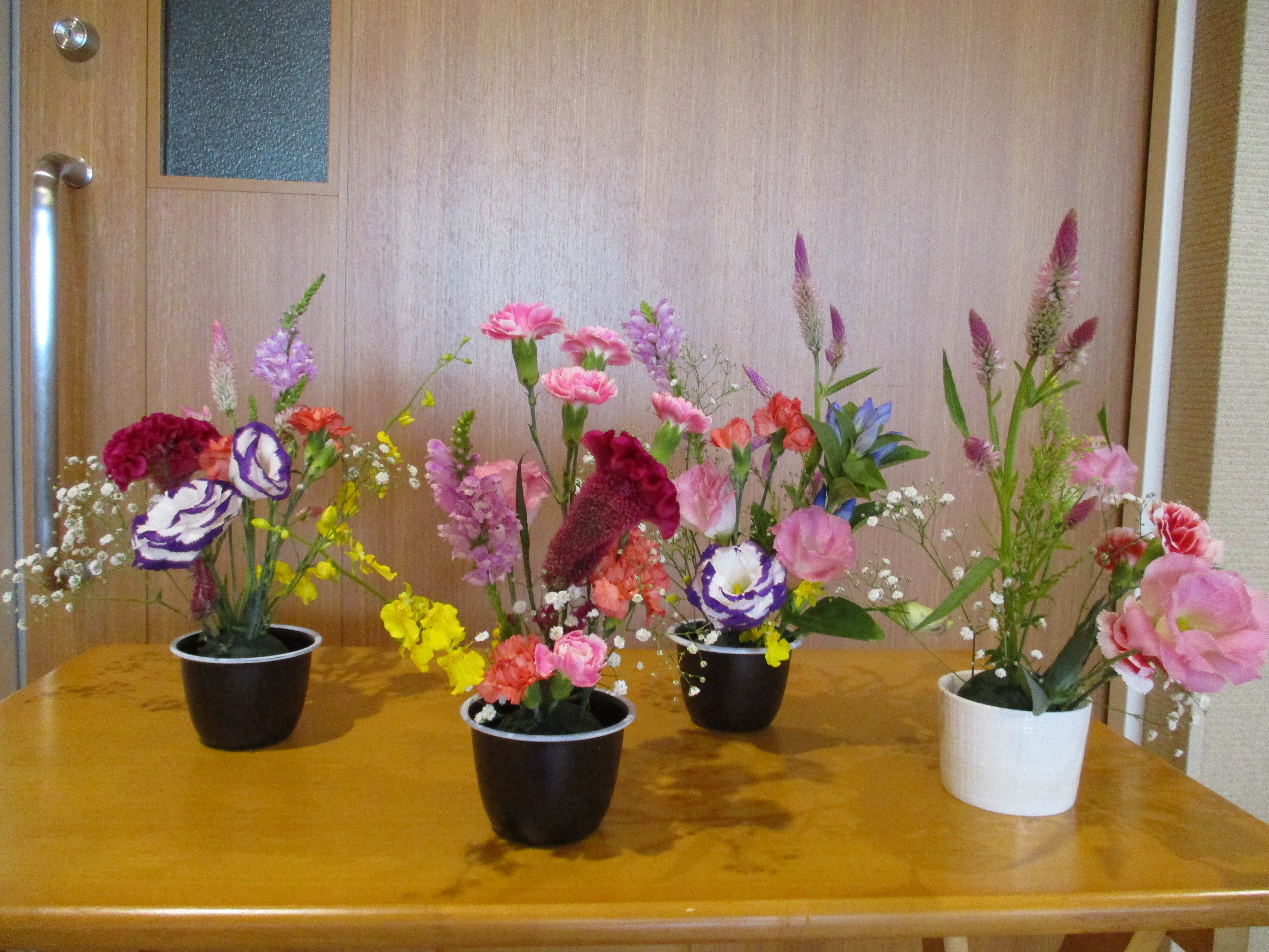 利用者さまにフラワーアレンジメントを作っていただきました。どの作品も綺麗に出来上がりました。