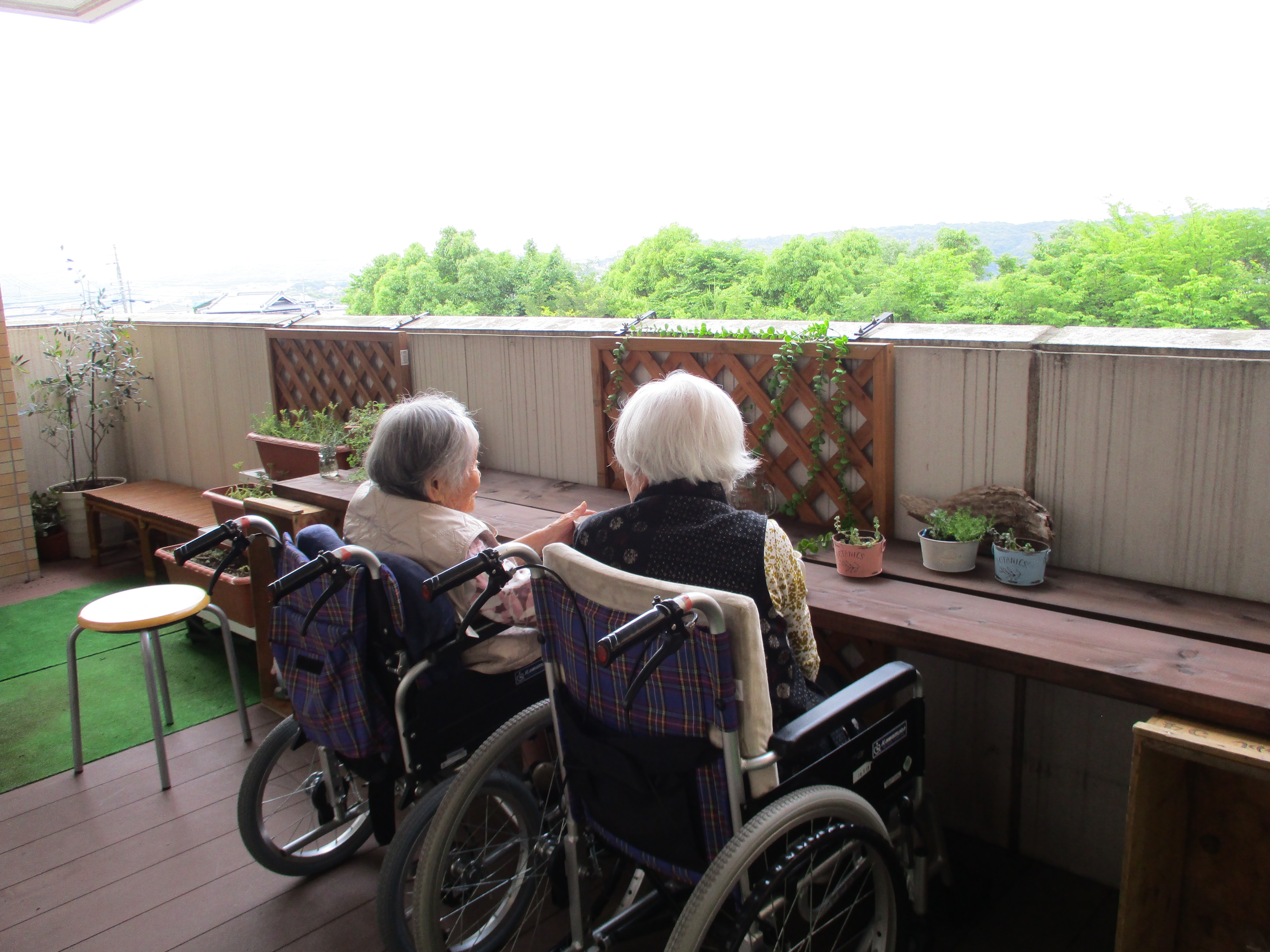 3階では、ベランダを改造しオープンカフェ風にしました。天気の良い日にお茶を飲んだり、お話ししたり利用者さまに非日常的な空間で楽しんで頂いています。