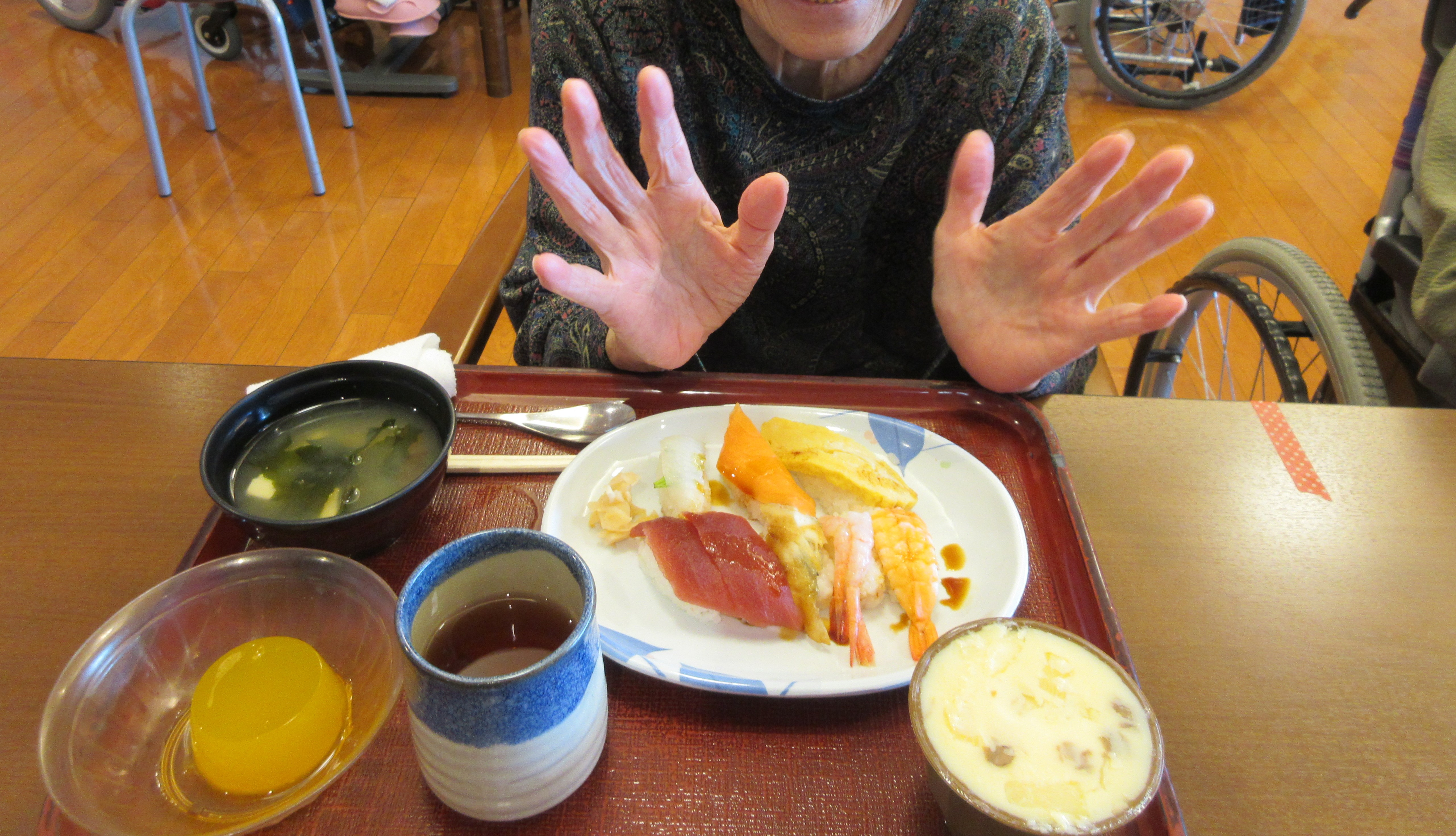 昼食にお寿司を食べました。いつもと違うメニューに皆さま、お箸も進みました。