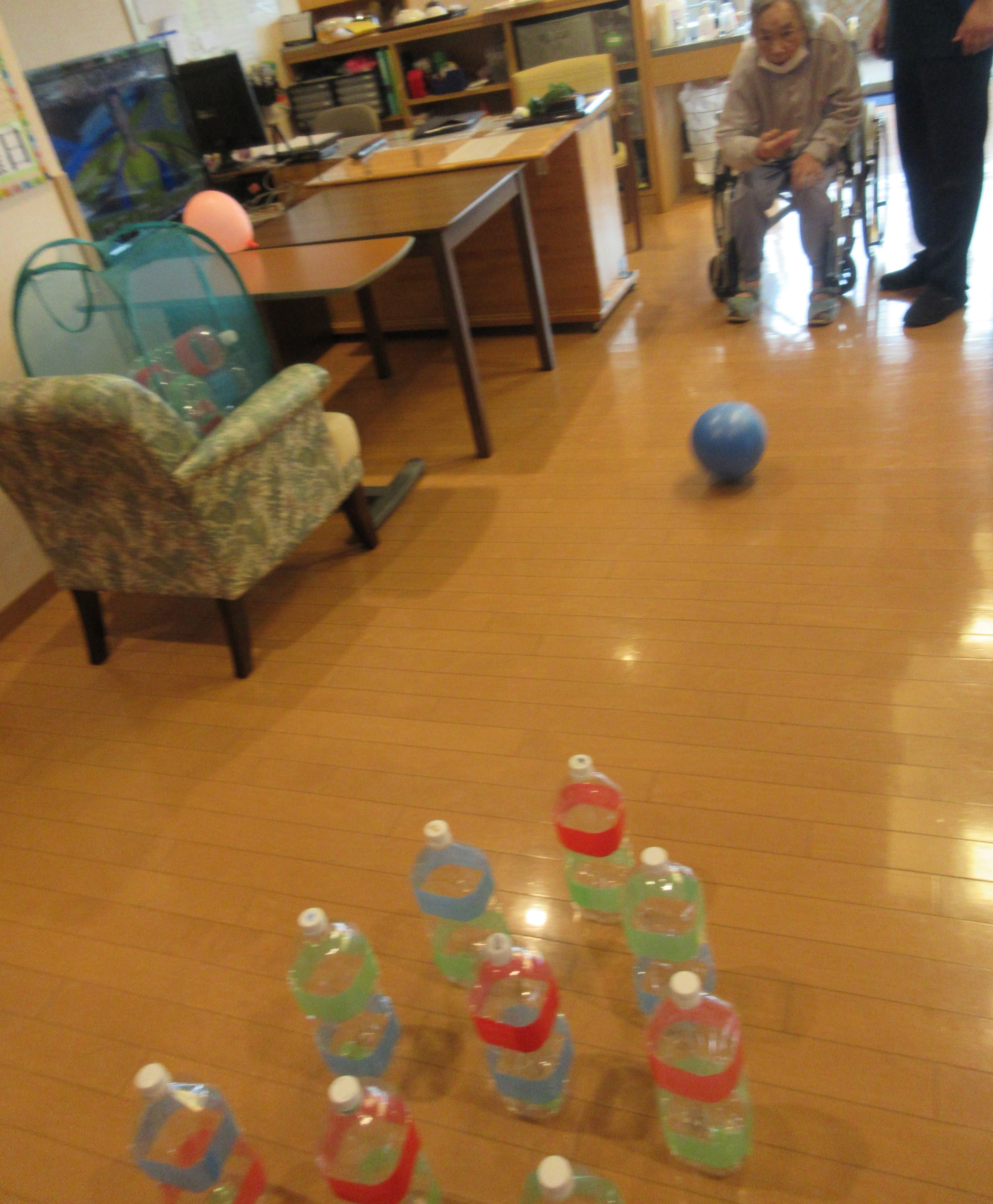 集団リハビリで、ボウリングゲームを行いました。ボールを投げることで腕の筋力や手指の巧緻性の向上を図ることができます。皆さまで点数を競い合うことで、他者交流の促進や意欲向上の効果が得られます。