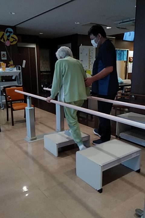 在宅復帰に向けて、自宅の段差を想定した昇降練習を実施しています。