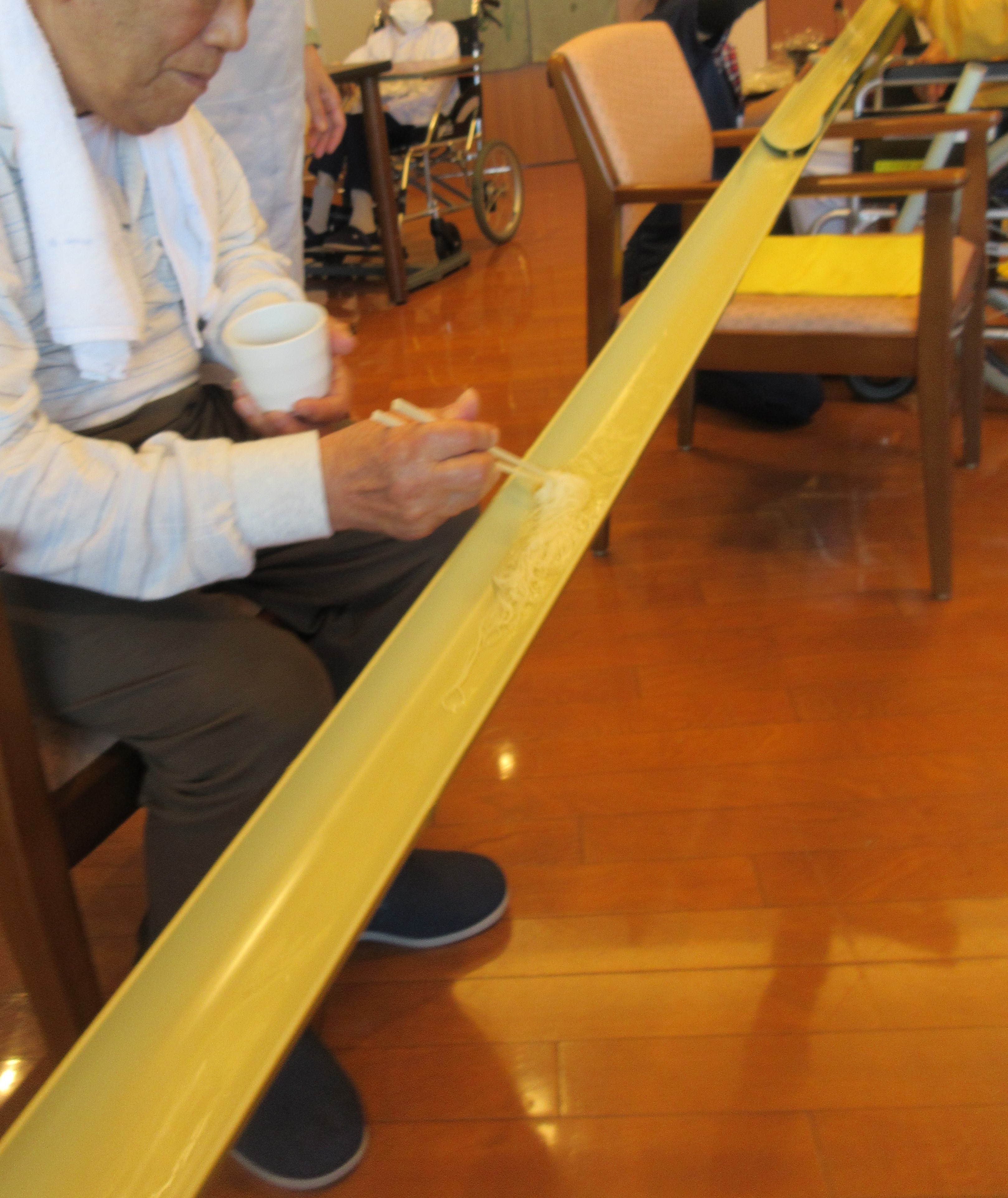 夏恒例の「流し素麺」を行いました。皆さま、上手に素麺をすくって食べられていました。