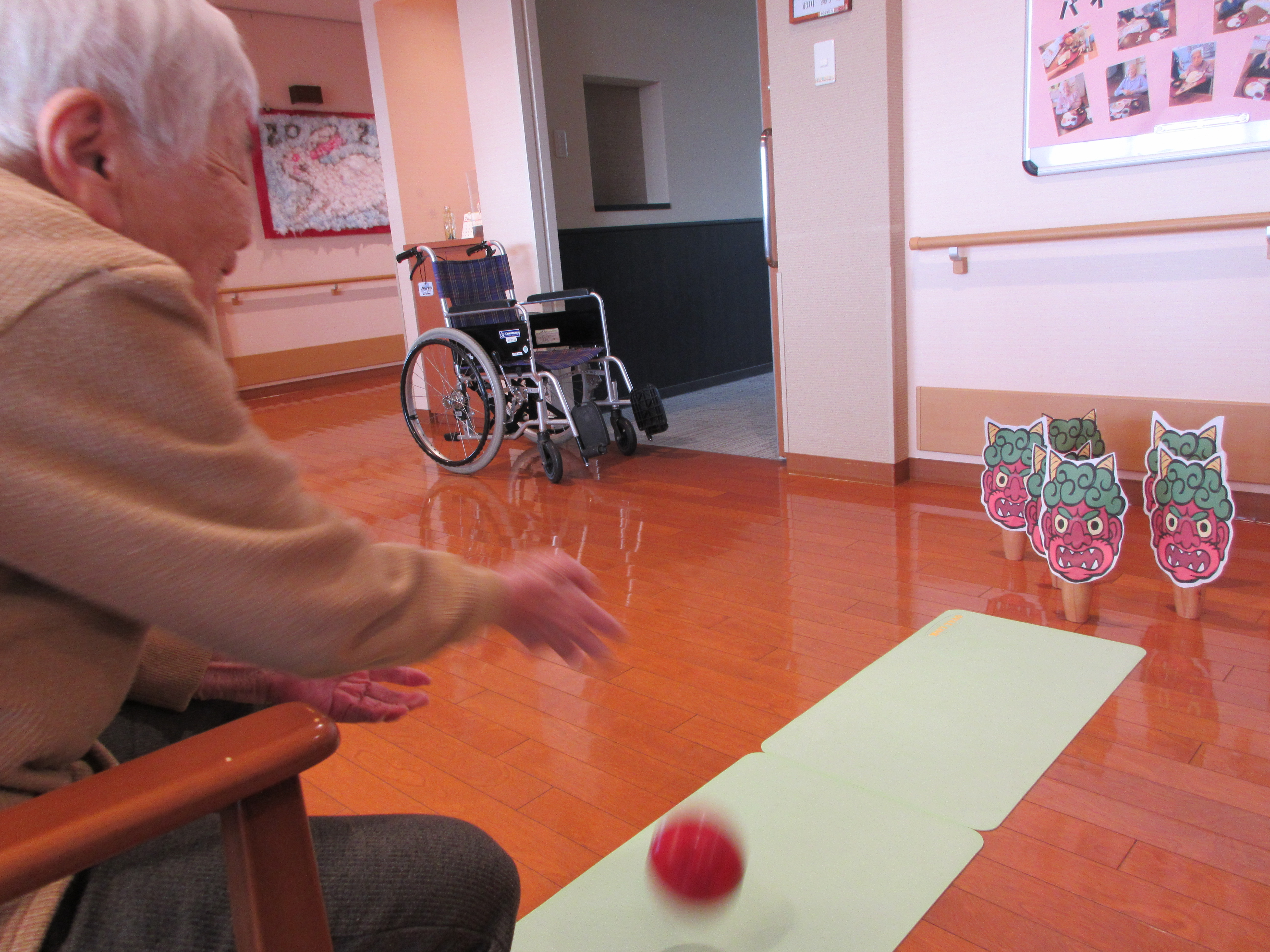 節分の日に鬼に見立てたピンを使い、ボーリングを行いました。皆さま、ピンめがけて集中して投げられました。