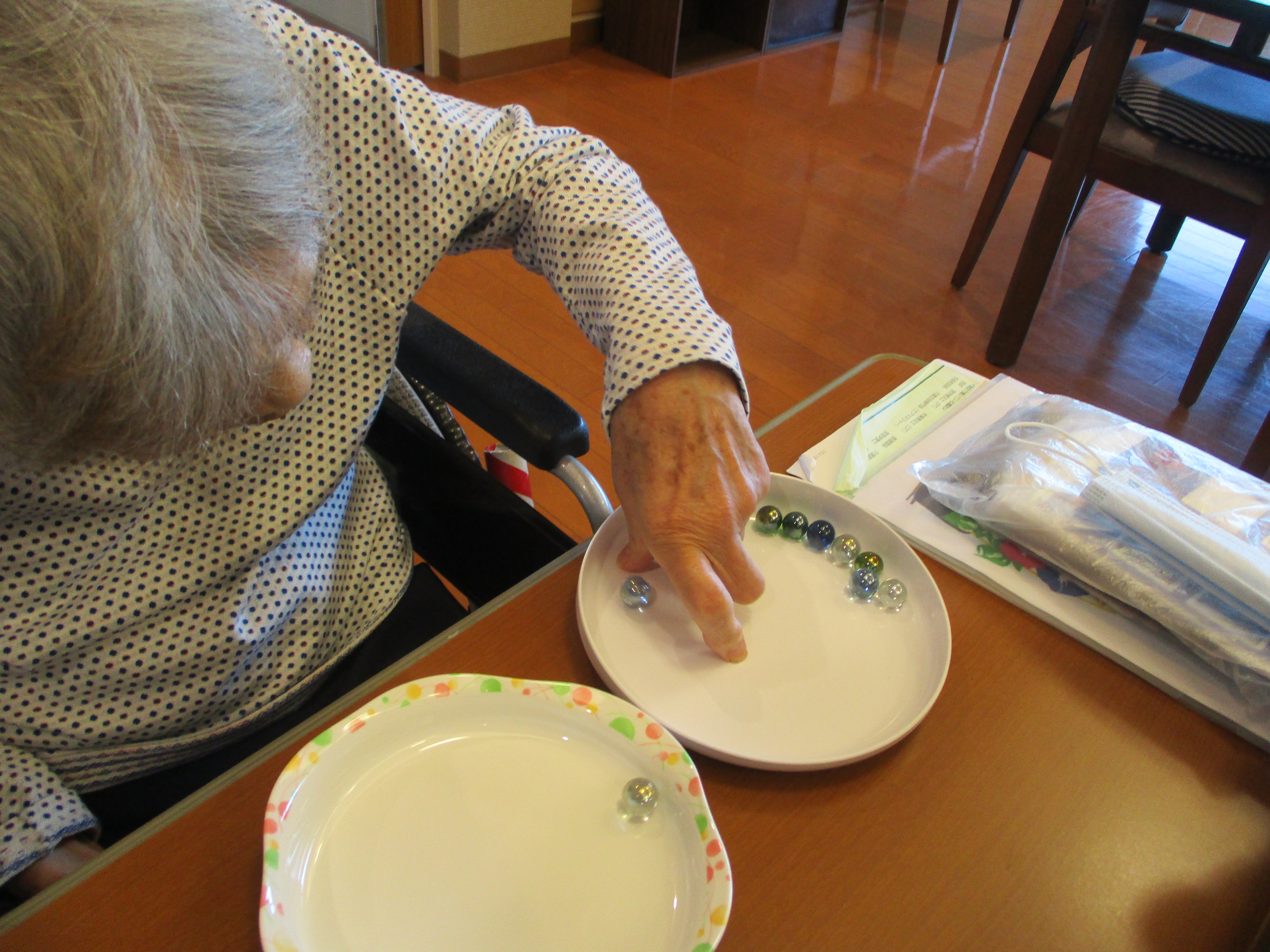 ビー玉をつかんで隣の皿に移します。手指の巧緻性向上やつまむ力をつけるトレーニングになります。